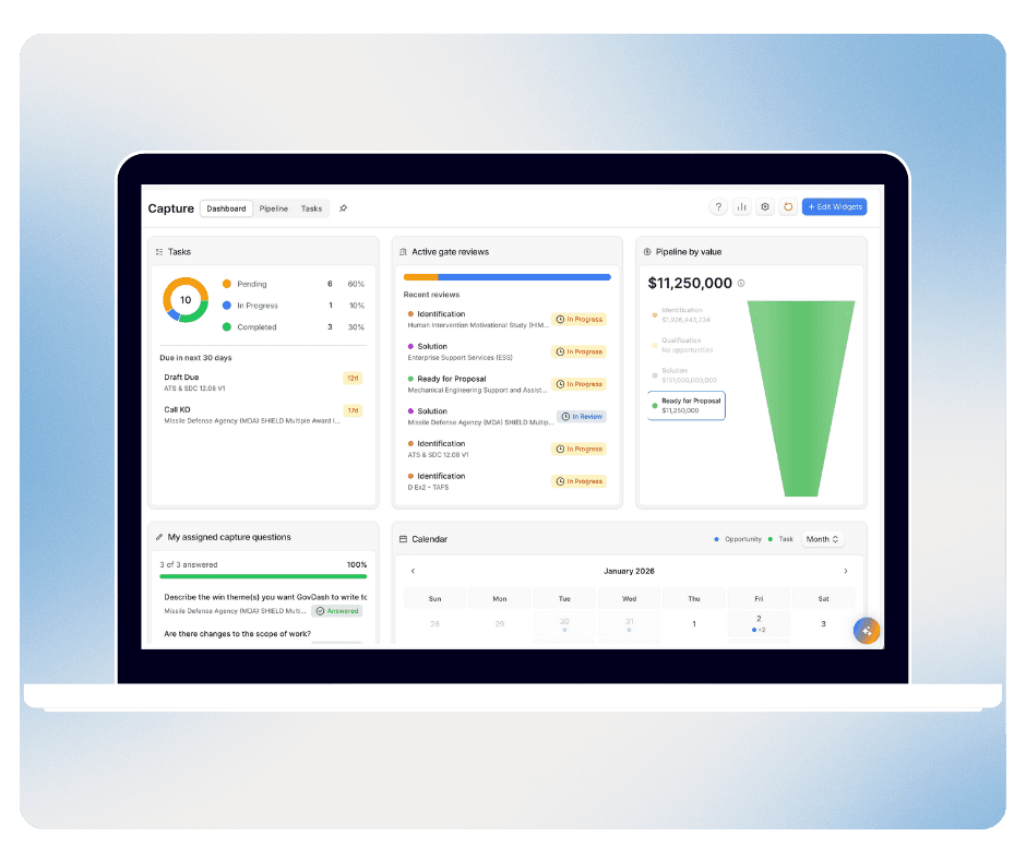 GovDash takes a different approach. Instead of adapting a generic platform to federal contracting, we built the entire system around how government contractors actually work: gate reviews, compliance matrices, past performance tracking, FAR/DFARS requirements, and multi-stage proposal development. You don't need custom fields or workarounds because the workflows are already designed for your process.