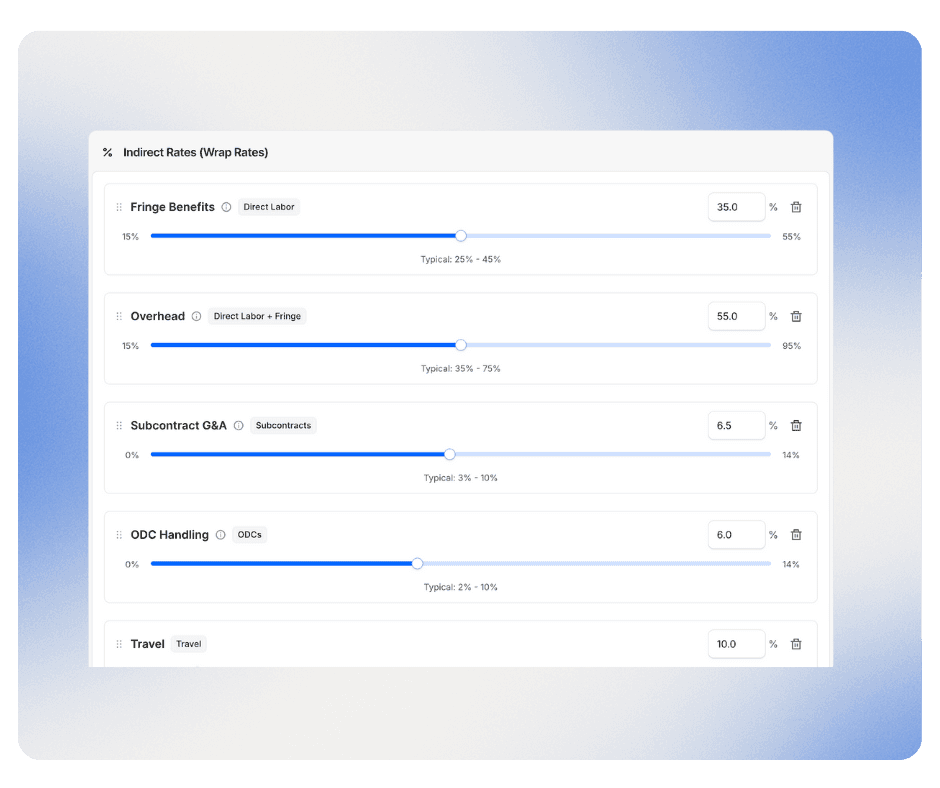 Teams can configure indirect rates using either additive or multiplicative formulas and dynamically adjust overhead, G&A, and fees. The wrap rate calculation is always visible, making pricing logic transparent and easy to explain internally.