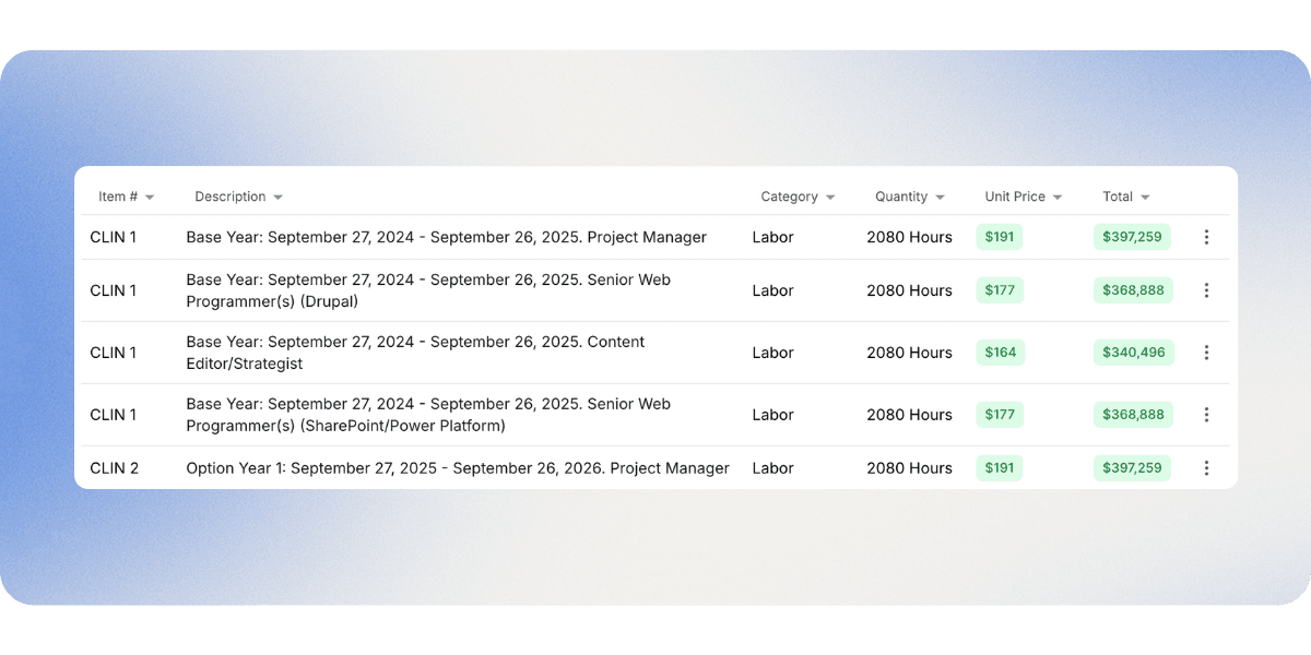 GovDash Pricer automatically extracts line items from the solicitation and displays year-by-year labor projections. Labor categories can be linked directly to CLINs, so unit prices, quantities, and totals stay consistent as assumptions change.