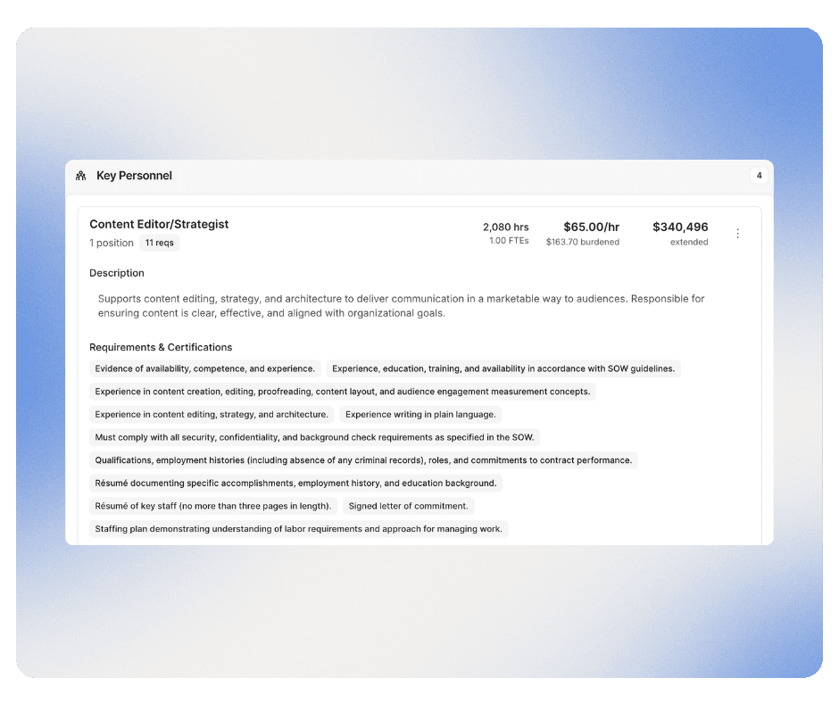 As soon as extraction is complete, labor categories are automatically populated from the Section L/M requirements. Each labor category maps directly to LCAT descriptions and qualifications, giving teams immediate context for staffing decisions.