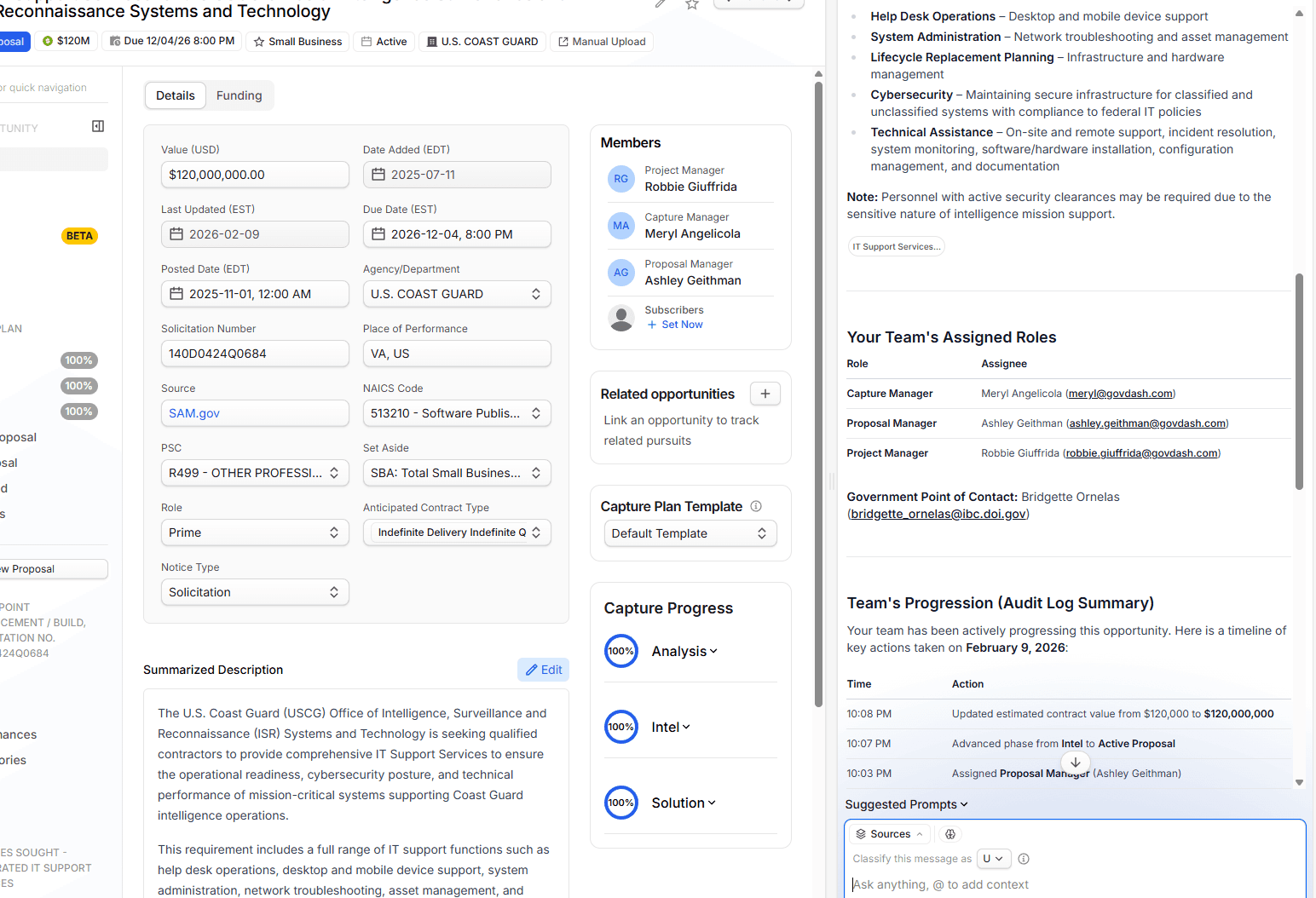 As an opportunity stays in your pipeline longer, your team should be getting smarter about it. GovDash is built to support that progression.