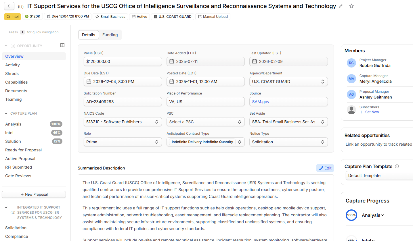 That early opportunity record becomes the home base. It’s where information starts small and gets smarter over time. Notes, assumptions, intel, strategy, and documents all accumulate in one place as the government moves closer to a formal solicitation. Nothing gets lost. Nothing gets recreated.