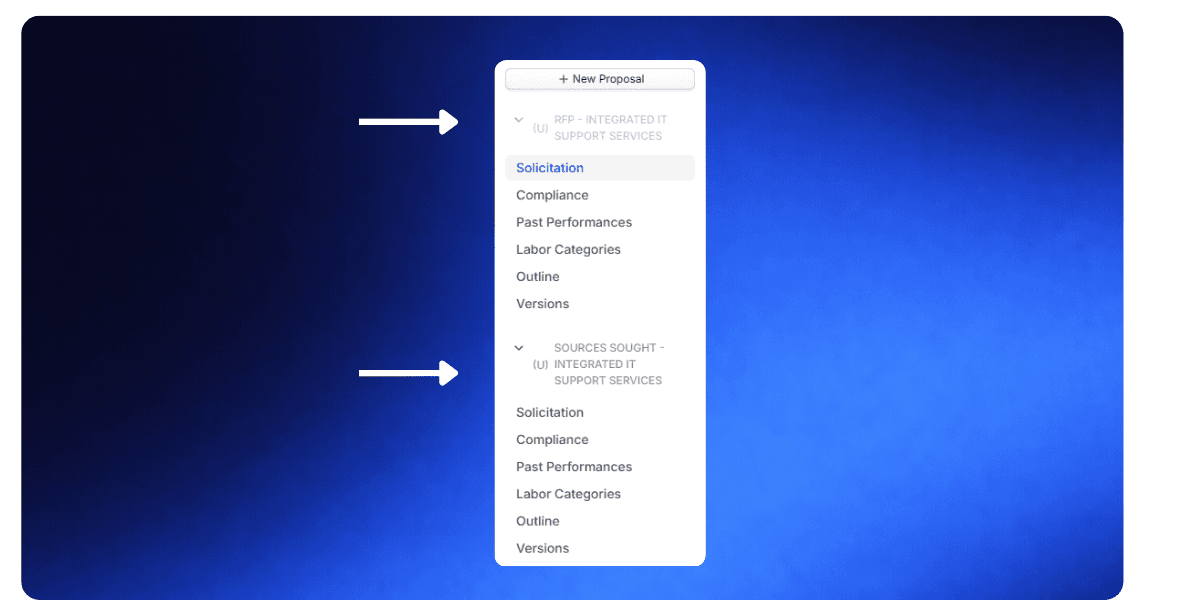 Within a single opportunity, you can create separate proposals for each response you submit. A white paper, an RFI response, and a final RFP proposal can each have their own documents, requirements, and workflows.