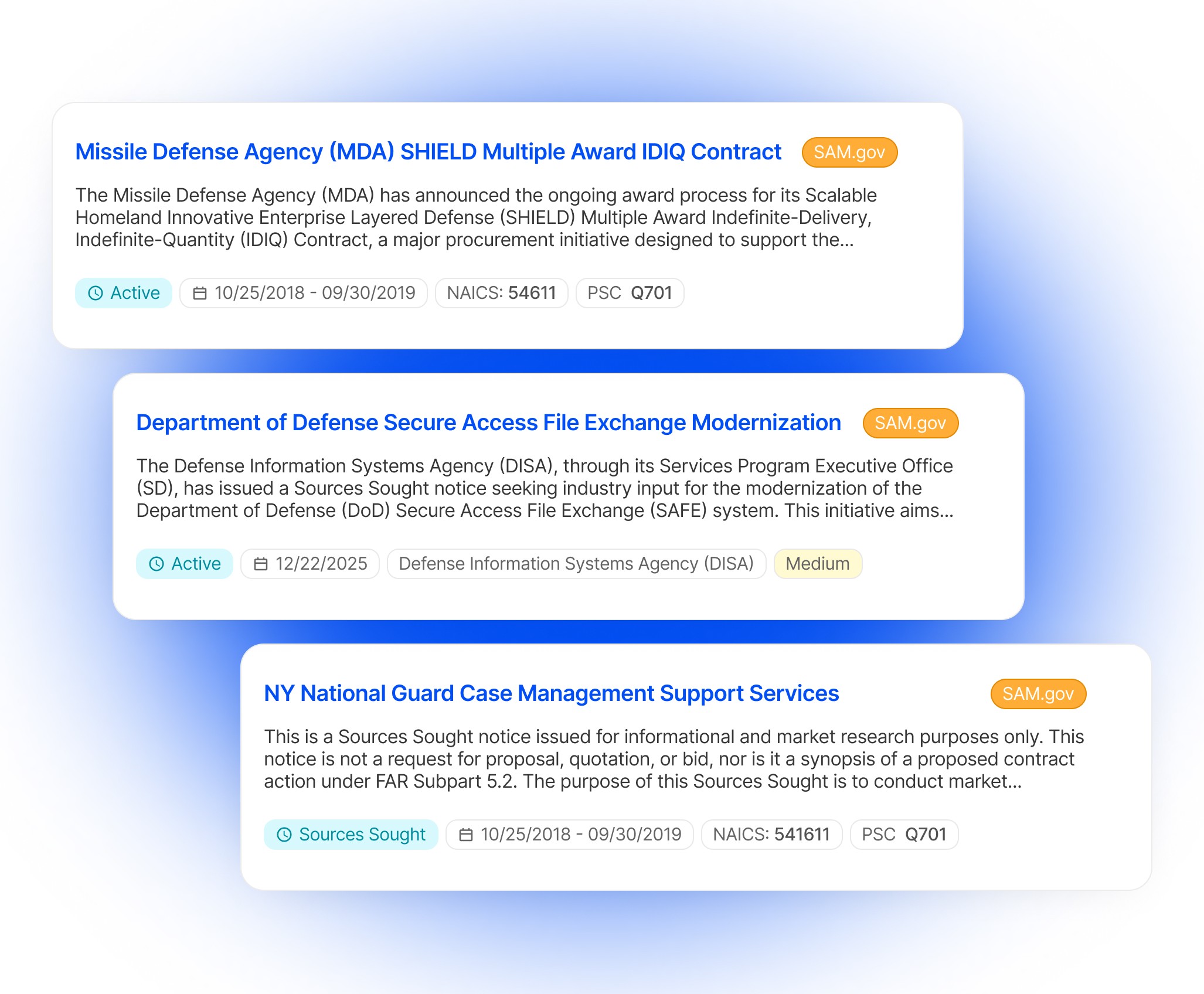 Every opportunity is automatically tracked, qualified, and organized. Never miss a recompete or lose track of a potential contract across the defense and intelligence sectors.