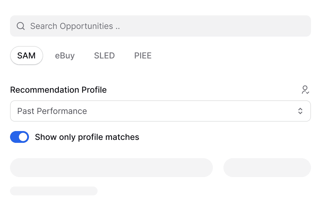 Get matched with opportunities that align with your business capabilities and past performance. Uses NAICS and PSC codes to surface the most relevant opportunities, improving over time.