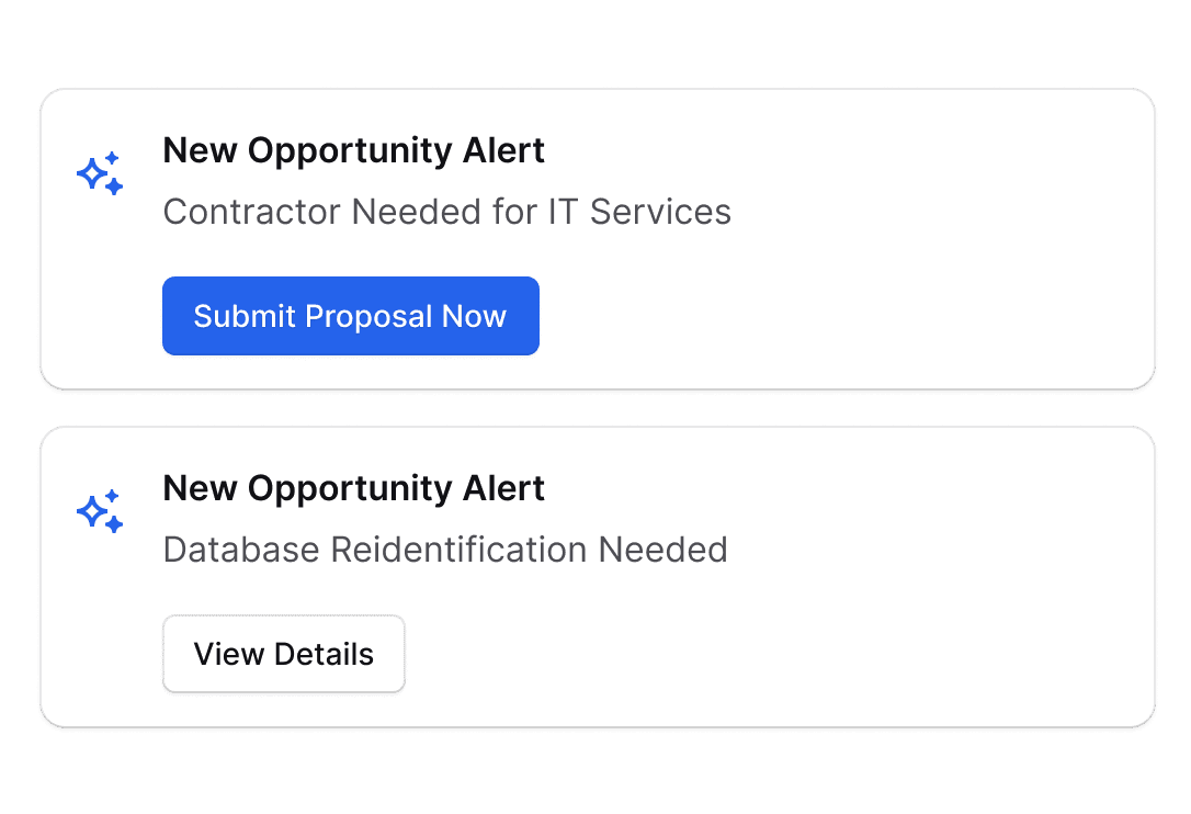 Stay ahead with instant notifications when new relevant opportunities are posted. Get AI-matched alerts delivered to your inbox so you never miss a contract.