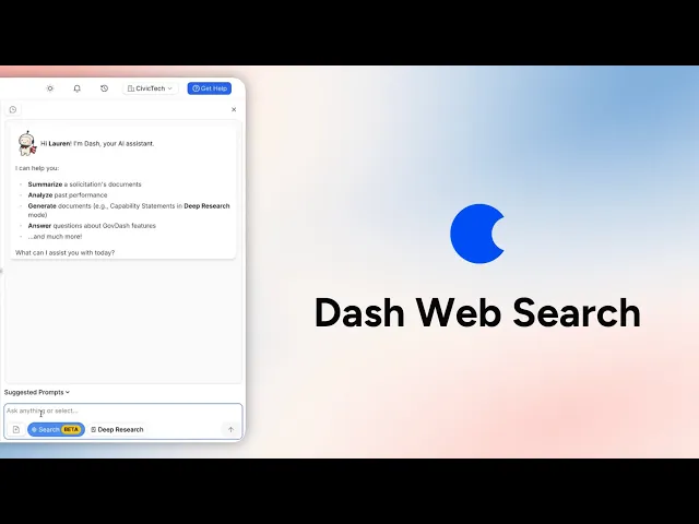 Ask Dash to summarize solicitations, clarify task areas, or align your capabilities with opportunity requirements, all within your workflow.