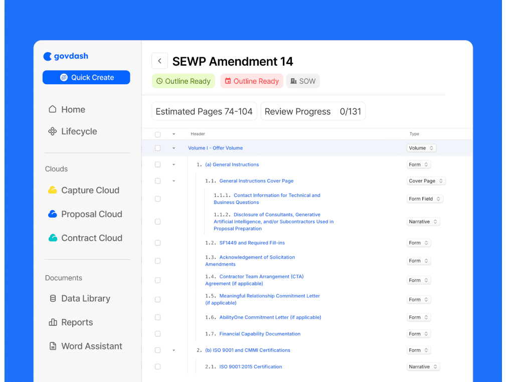 The new shredding engine and compliance matrix view changes how teams extract requirements and track proposal alignment. Enhanced citation capabilities, outline snapshots with undo/redo functionality, and support for multiple proposals per opportunity give teams unprecedented control and confidence throughout the proposal lifecycle.